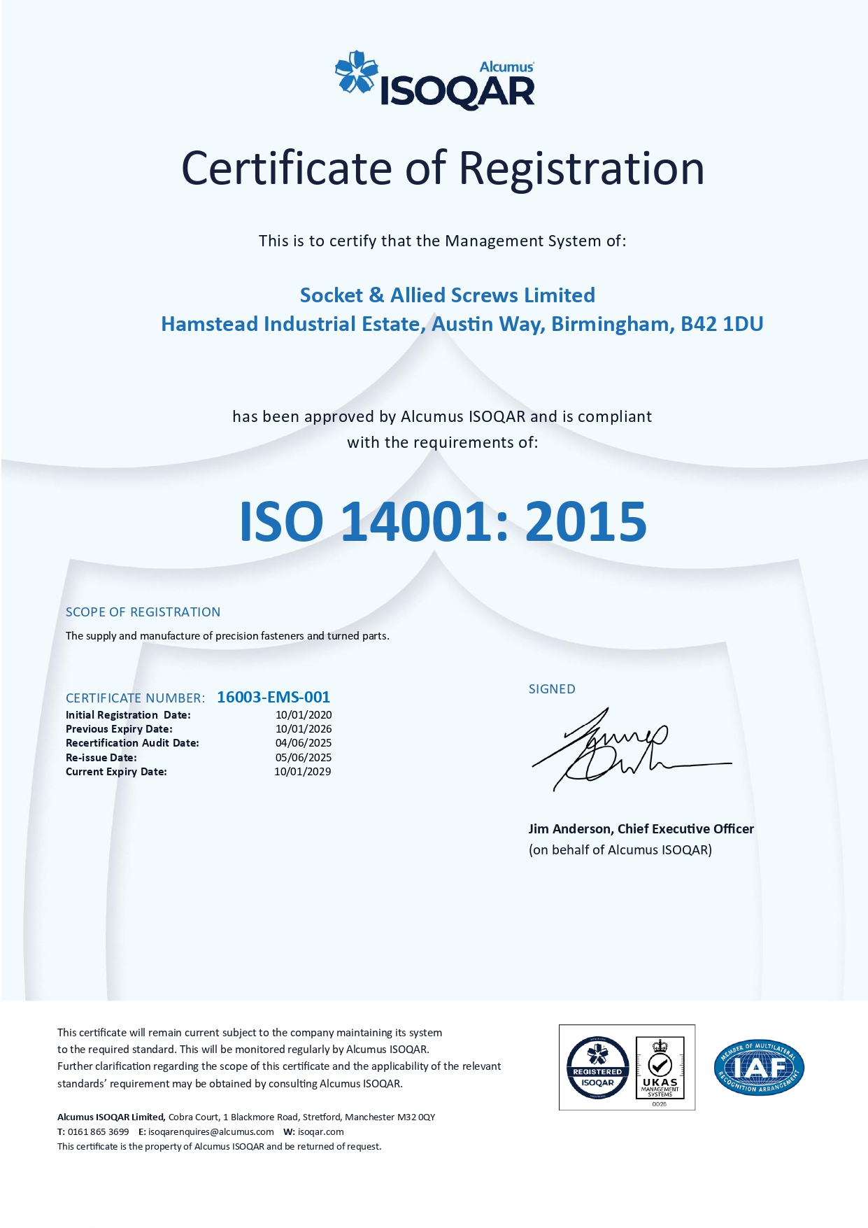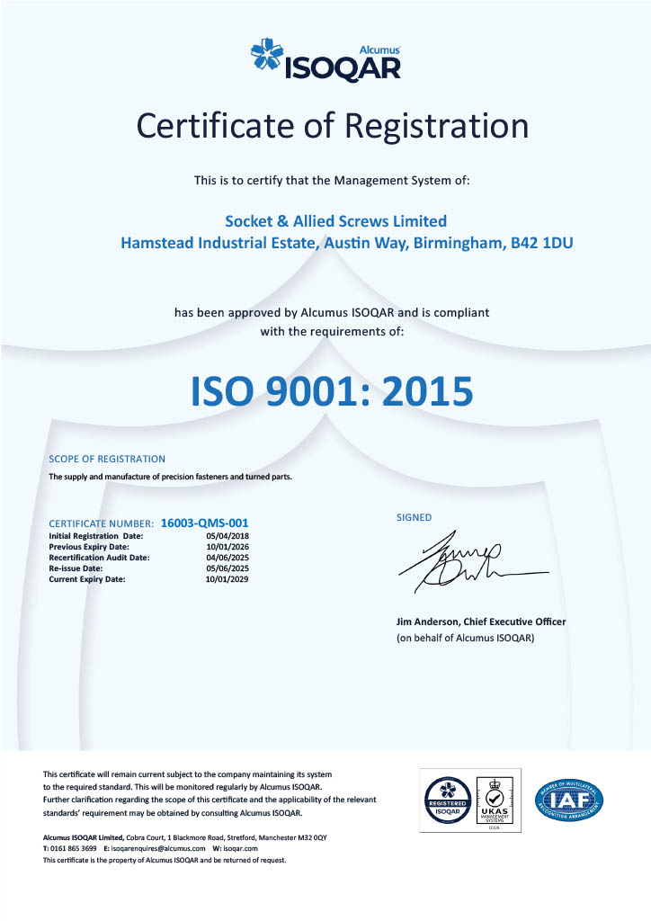 Socket & Allied Screws is quality approved to IS0 9001:2015 and can offer ‘FAIR’ and 'ISIR' Level 3 Documentation.